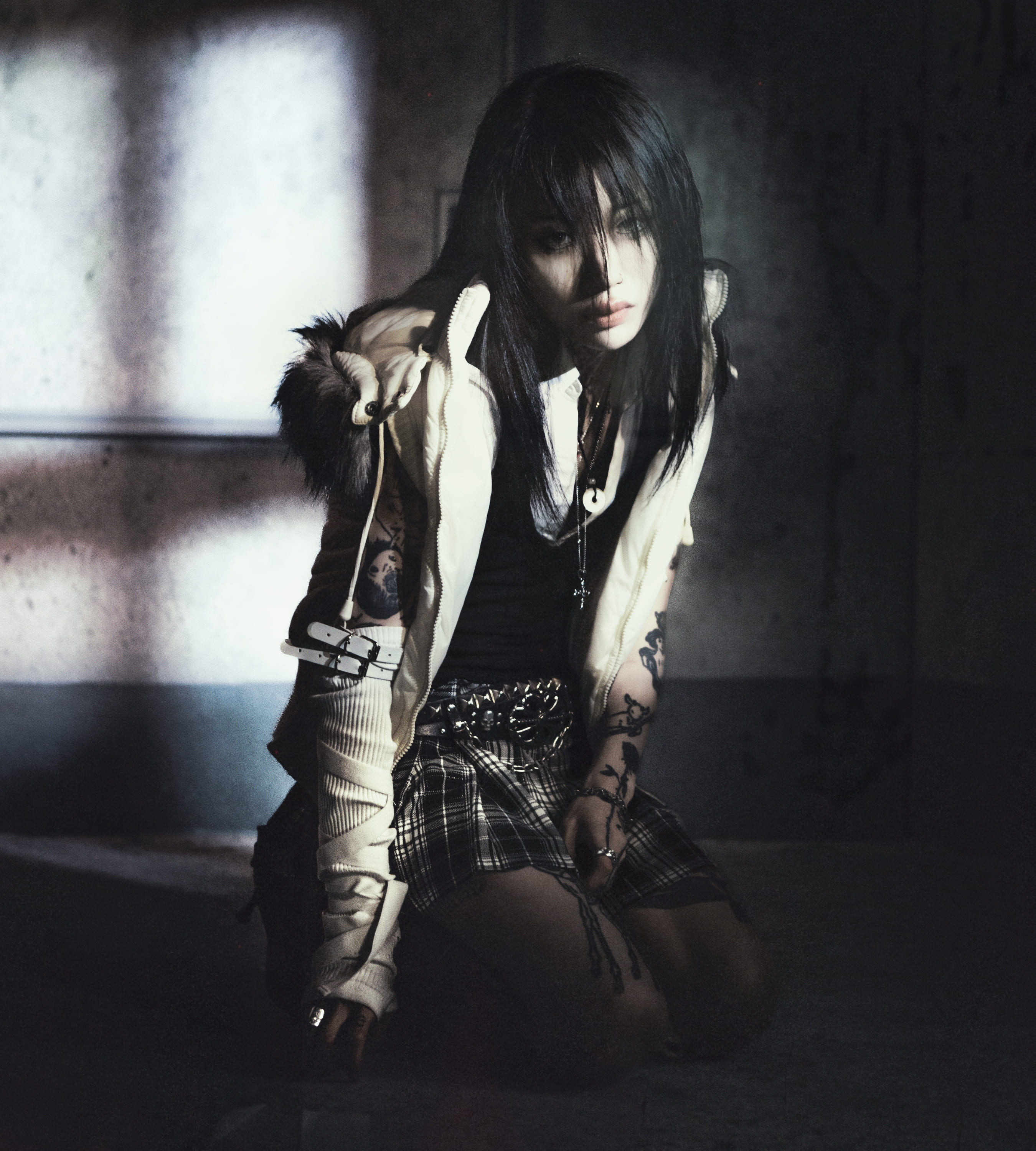 Y:あれはもっと幻想的で、SFやビデオゲームからインスピレーションを得た。私は子供のころ『ファイナルファンタジー』をたくさんプレイしていたの。天野喜孝のアートワークが本当に美しいと思っていて、彼のキャラクターデザインは私の衣装のインスピレーションにもなってる。アーティスト名のユールも『ファイナルファンタジーXIII』からとってるしね。『ファイナルファンタジーXV』もたくさんプレイしていて、ノクティスとその仲間たちがバイクや車に乗っているのがすごく好きで、そこから車に興味を持つようになった。私はJDM車(註:“Japanese Domestic Market”の略で、日本国内市場で販売されている車、または海外で販売されている日本車を日本国内の仕様にカスタムした車のこと)、例えば、マツダのRX-7みたいな昔の日本車が大好きで。最初は車で撮影しようとしてたんだけど、衣装がもっと見えるようにダートバイク(オフロードバイク)にした。ビジュアル的にもシネマティックで、ディストピアっぽさが出たと思う。MVの中の世界観は、私たちが天使のような存在を狩るハンターで、『エヴァンゲリオン』から着想を得てる。あの作品では使徒を倒さなきゃいけないでしょ? そういう暴力の物語とサイバーパンクの美学を組み合わせたかった。MVの脚本もちゃんと書いたんだけど、もちろんフルで実現はできなかった。でも、アップビートなポップ・ソング/ダンス・ソングに合わせて、そういう美しいシネマティックな映像を作るのは本当に楽しかった。幻想的なヴィジュアルとポップなサウンドの組み合わせがすごく面白くて。あと、デザイナーの友人たちも協力してくれたから、ファッションもたくさん見せたかった。私がMVで着用しているヘッドピースを作ってくれたのは、上海の友人で、素晴らしい才能を持つデザイナーのネイムヴァーグ。彼女は上海のショーのスタイリングもしてくれた。ファッションも私にとって表現のひとつだからね。「このブーツがバイクに乗っているところを見せたい!」って言ってショーケースするのが大好きなの! ヴィジュアルを制作するときは、そんな風によく考えてる!